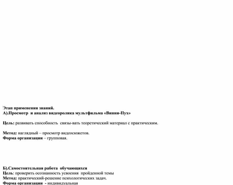 Б).Самостоятельная работа обучающихся Цель: проверить осознанность усвоения пройденной темы Метод: практический-решение психологических задач. Форма организации - индивидуальная