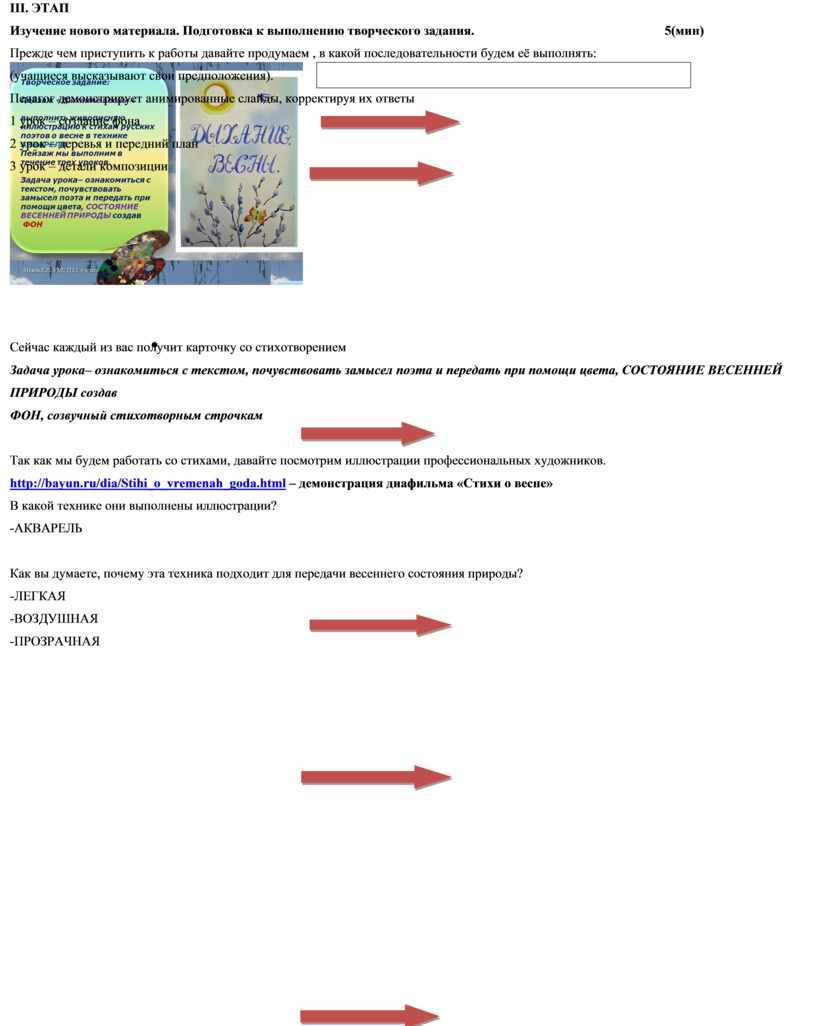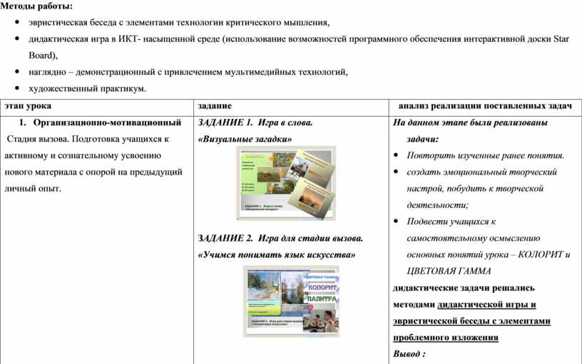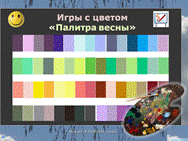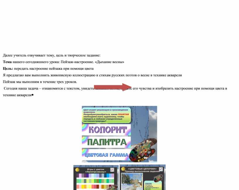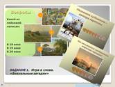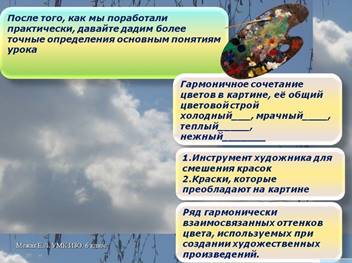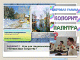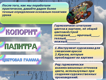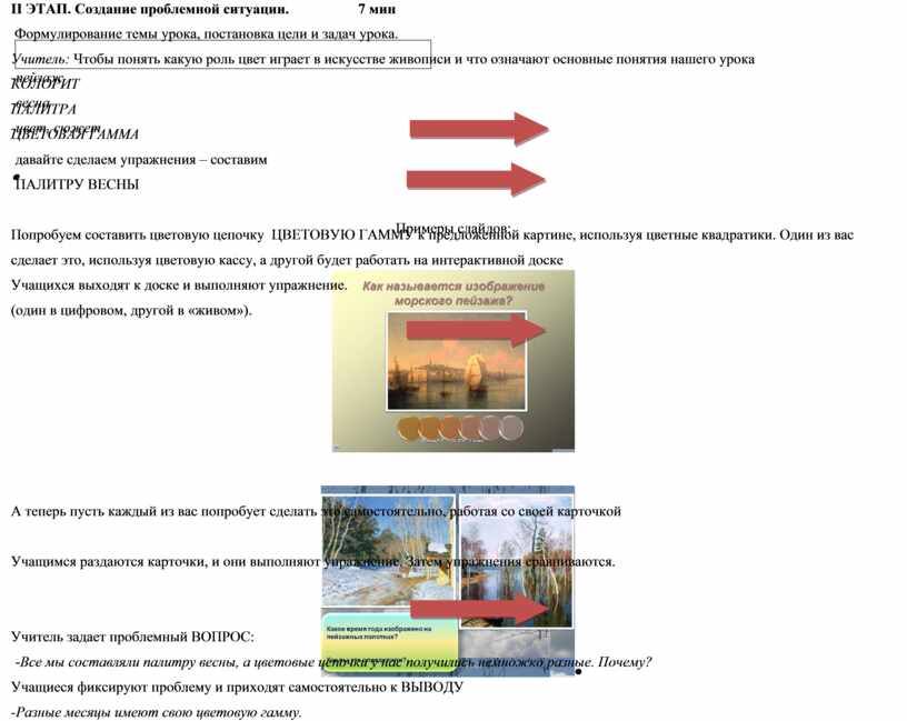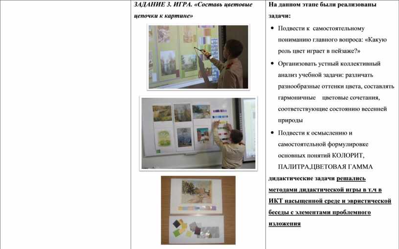 На данном этапе были реализованы задачи: — Подвести к самостоятельному пониманию главного вопроса: «Какую роль цвет играет в пейзаже?» — Организовать устный коллективный анализ учебной задачи: различать разнообразные оттенки цвета, составлять гармоничные цветовые сочетания, соответствующие состоянию весенней природы — Подвести к осмыслению и самостоятельной формулировке основных понятий КОЛОРИТ, ПАЛИТРА,ЦВЕТОВАЯ ГАММА дидактические задачи решались методами дидактической игры в т.ч в ИКТ насыщенной среде и эвристической беседы с элементами проблемного изложения