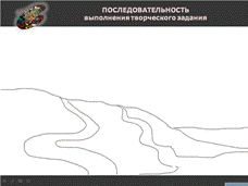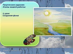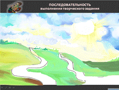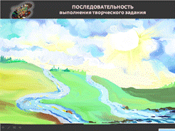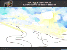 На данном этапе была реализована задача: — Научить облекать вербальные литературные образы в зримую художественную форму дидактические задачи решались методом наглядной демонстрации последовательности работы в ИКТ-насыщенной среде с активным использованием анимации и мастер класса (демонстрации приемов работы акварелью) Вывод: На данном этапе было важно обеспечить качественную быструю демонстрацию приемов и последовательности работы. Основная задача этапа была достигнута благодаря подготовленному заранее цифровому ресурсу, дающему возможность продемонстрировать все приемы и последовательность действий за короткий срок