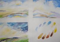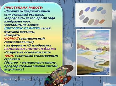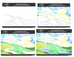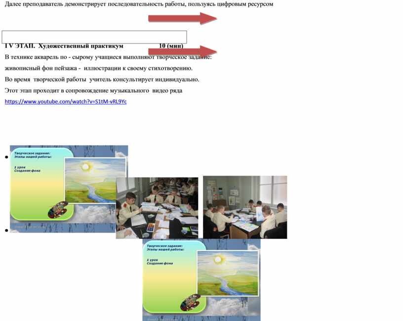 В технике акварель по - сырому учащиеся выполняют творческое задание: живописный фон пейзажа - иллюстрации к своему стихотворению. Во время творческой работы учитель консультирует индивидуально. Этот этап проходит в сопровождение музыкального видео ряда https://www.youtube.com/watch?v=S1tM-vRL9Yc