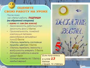 Удалось передать состояние природы цветом 3 балла Удалось передать легкость и воздушность акварели 3 балла Активная работа в начале урока 1 балл Устные ответы по 1 баллу за каждый верный ответ Если получилось в сумме 13 баллов и выше, оценка – 5 7-17 баллов – 4 Меньше 7 – необходимо еще поработать |