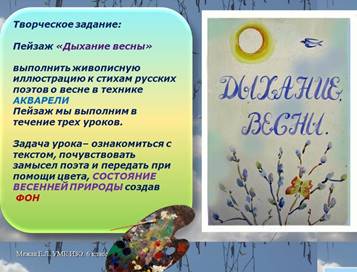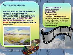 Сейчас каждый из вас получит карточку со стихотворением Задача урока– ознакомиться с текстом, почувствовать замысел поэта и передать при помощи цвета, СОСТОЯНИЕ ВЕСЕННЕЙ ПРИРОДЫ создав