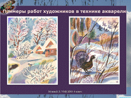 Так как мы будем работать со стихами, давайте посмотрим иллюстрации профессиональных художников. http://bayun.ru/dia/Stihi_o_vremenah_goda.html – демонстрация диафильма «Стихи о весне» В какой технике они выполнены иллюстрации? -АКВАРЕЛЬ