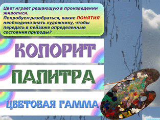 — Дать понятия «Колорит», «Цветовая гамма»,«Палитра».