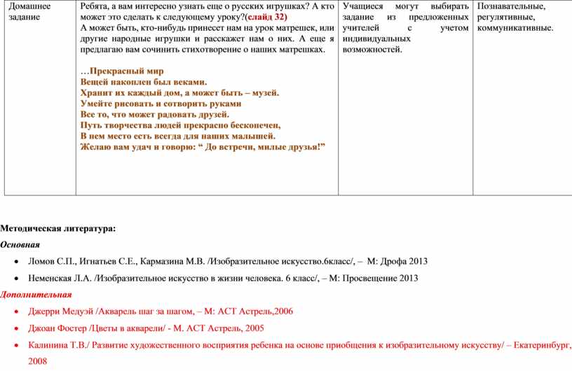 Формы работы учащихся: творческая работа, работа с литературными источниками, электронными ресурсами, выполнение индивидуальных заданий, взаимопроверка, самопроверка, анализ художественных произведений