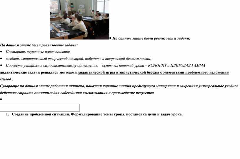 На данном этапе были реализованы задачи: — Повторить изученные ранее понятия. — создать эмоциональный творческий настрой, побудить к творческой деятельности; — Подвести учащихся к самостоятельному осмыслению основных понятий урока – КОЛОРИТ и ЦВЕТОВАЯ ГАММА дидактические задачи решались методами дидактической игры и эвристической беседы с элементами проблемного изложения Вывод : Суворовцы на данном этапе работали активно, показали хорошие знания предыдущего материала и закрепили универсальное учебное действие строить понятные для собеседника высказывания о произведение искусства