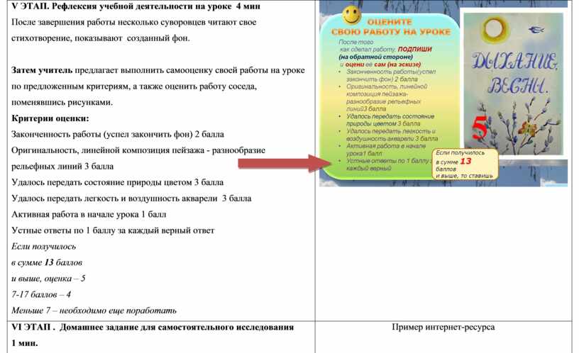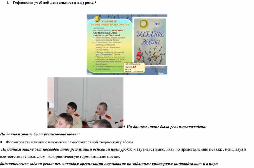 На данном этапе была реализованазадача: — Формировать навыки самооценки самостоятельной творческой работы На данном этапе был подведен итог реализации основной цели урока: «Научиться выполнять по представлению пейзаж , используя в соответствии с замыслом колористическую гармонизацию цвета». дидактические задачи решались методом организации оценивания по заданным критериям индивидуально и в пара Вывод: Благодаря четко продуманным и имеющимся перед глазами каждого суворовца критериям, суворовцы смогли быстро выполнить самооценку и оценку работ,