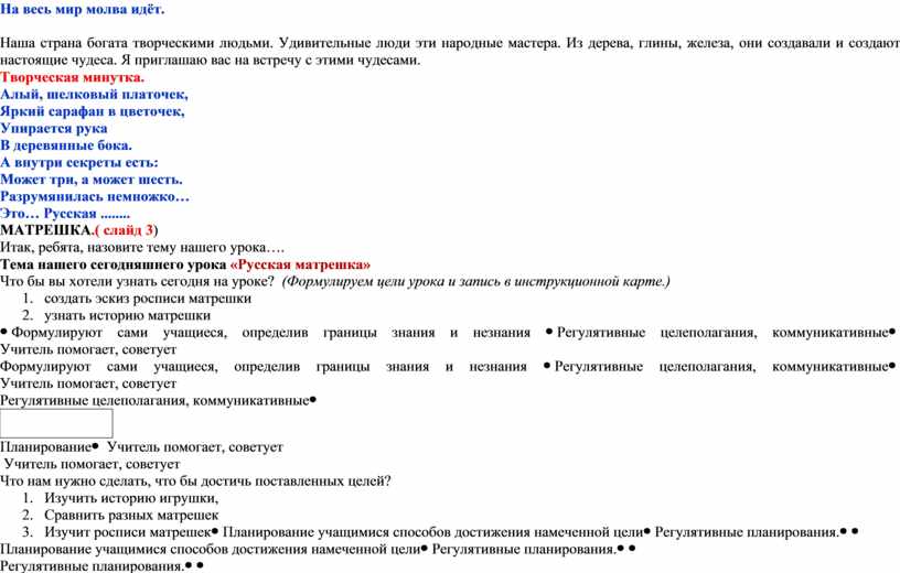 Наша страна богата творческими людьми. Удивительные люди эти народные мастера. Из дерева, глины, железа, они создавали и создают настоящие чудеса. Я приглашаю вас на встречу с этими чудесами. Творческая минутка. Алый, шелковый платочек, МАТРЕШКА.( слайд 3) Итак, ребята, назовите тему нашего урока…. Тема нашего сегодняшнего урока «Русская матрешка» Что бы вы хотели узнать сегодня на уроке? (Формулируем цели урока и запись в инструкционной карте.)