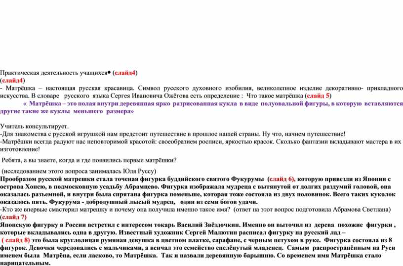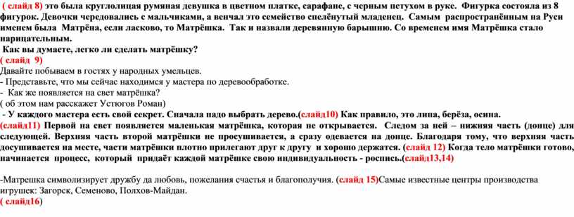 Учитель консультирует. -Для знакомства с русской игрушкой нам предстоит путешествие в прошлое нашей страны. Ну что, начнем путешествие! -Матрёшки всегда радуют нас неповторимой красотой: своеобразием росписи, яркостью красок. Сколько фантазии вкладывают мастера в их изготовление! Ребята, а вы знаете, когда и где появились первые матрёшки? (исследованием этого вопроса занималась Юля Руссу) Прообразом русской матрешки стала точеная фигурка буддийского святого Фукурумы (слайд 6), которую привезли из Японии с острова Хонсю, в подмосковную усадьбу Абрамцево. Фигурка изображала мудреца с вытянутой от долгих раздумий головой, она оказалась разъемной, и внутри была спрятана фигурка поменьше, которая тоже состояла из двух половинок. Всего таких куколок оказалось пять. Фукурума - добродушный лысый мудрец, один из семи богов удачи. -Кто же впервые смастерил матрешку и почему она получила именно такое имя? (ответ на этот вопрос подготовила Абрамова Светлана) (слайд 7) Японскую фигурку в России встретил с интересом токарь Василий Звёздочкин. Именно он выточил из дерева похожие фигурки , которые вкладывались одна в другую. Известный художник Сергей Малютин расписал фигурку на русский лад – ( слайд 8) это была круглолицая румяная девушка в цветном платке, сарафане, с черным петухом в руке. Фигурка состояла из 8 фигурок. Девочки чередовались с мальчиками, а венчал это семейство спелёнутый младенец. Самым распространённым на Руси именем была Матрёна, если ласково, то Матрёшка. Так и назвали деревянную барышню. Со временем имя Матрёшка стало нарицательным. Как вы думаете, легко ли сделать матрёшку? ( слайд 9) Давайте побываем в гостях у народных умельцев. - Представьте, что мы сейчас находимся у мастера по деревообработке. - Как же появляется на свет матрёшка? ( об этом нам расскажет Устюгов Роман) - У каждого мастера есть свой секрет. Сначала надо выбрать дерево.(слайд10) Как правило, это липа, берёза, осина. (слайд11) Первой на свет появляется маленькая матрёшка, которая не открывается. Следом за ней – нижняя часть (донце) для следующей. Верхняя часть второй матрёшки не просушивается, а сразу одевается на донце. Благодаря тому, что верхняя часть досушивается на месте, части матрёшки плотно прилегают друг к другу и хорошо держатся. (слайд 12) Когда тело матрёшки готово, начинается процесс, который придаёт каждой матрёшке свою индивидуальность - роспись.(слайд13,14)