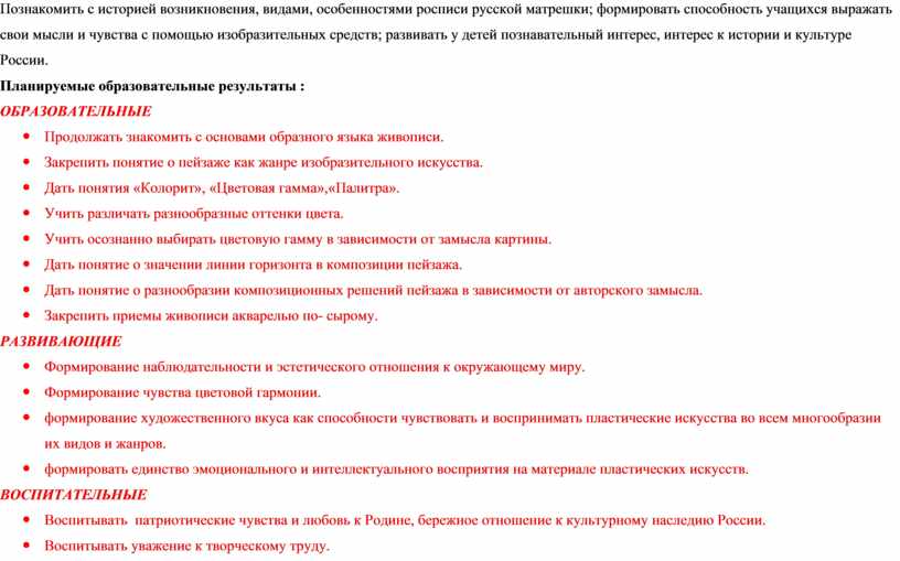 Познакомить с историей возникновения, видами, особенностями росписи русской матрешки; формировать способность учащихся выражать свои мысли и чувства с помощью изобразительных средств; развивать у детей познавательный интерес, интерес к истории и культуре России.