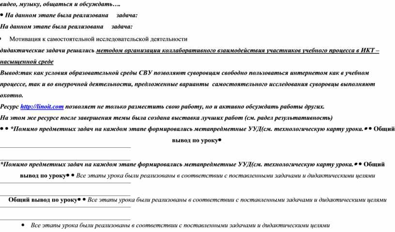На данном этапе была реализована задача: — Мотивация к самостоятельной исследовательской деятельности дидактические задачи решались методом организации коллаборативного взаимодействия участников учебного процесса в ИКТ – насыщенной среде Вывод:так как условия образовательной среды СВУ позволяют суворовцам свободно пользоваться интернетом как в учебном процессе, так и во внеурочной деятельности, предложенные варианты самостоятельного исследования суворовцы выполняют охотно. Ресурс http://linoit.com позволяет не только разместить свою работу, но и активно обсуждать работы других. На этом же ресурсе после завершения темы была создана выставка лучших работ (см. радел результативность)
