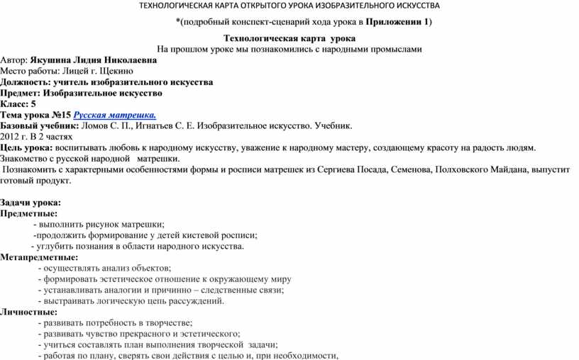 ТЕХНОЛОГИЧЕСКАЯ КАРТА ОТКРЫТОГО УРОКА ИЗОБРАЗИТЕЛЬНОГО ИСКУССТВА