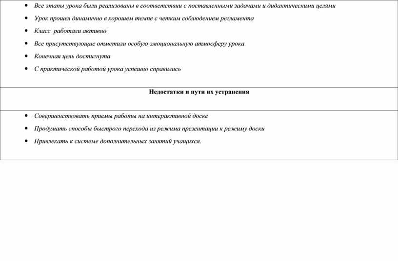 — Все этапы урока были реализованы в соответствии с поставленными задачами и дидактическими целями — Урок прошел динамично в хорошем темпе с четким соблюдением регламента — Класс работали активно — Все присутствующие отметили особую эмоциональную атмосферу урока — Конечная цель достигнута — С практической работой урока успешно справились