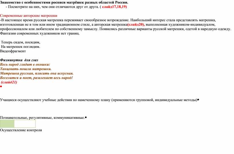 Познакомить с характерными особенностями формы и росписи матрешек из Сергиева Посада, Семенова, Полховского Майдана, выпустит готовый продукт.