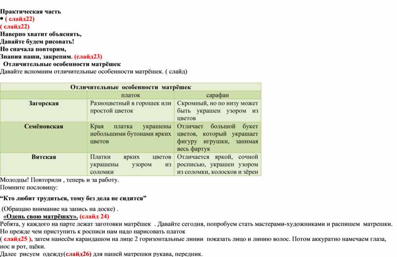 Молодцы! Повторили , теперь и за работу. Помните пословицу: “Кто любит трудиться, тому без дела не сидится” (Обращаю внимание на запись на доске) . «Одень свою матрёшку». (слайд 24) Ребята, у каждого на парте лежат заготовки матрёшек . Давайте сегодня, попробуем стать мастерами-художниками и распишем матрешки. Но прежде чем приступить к росписи нам надо нарисовать платок ( слайд25 ), затем нанесём карандашом на лице 2 горизонтальные линии показать лицо и линию волос. Потом аккуратно намечаем глаза, нос и рот, щёки. Далее рисуем одежду(слайд26) для нашей матрешки рукава, передник.
