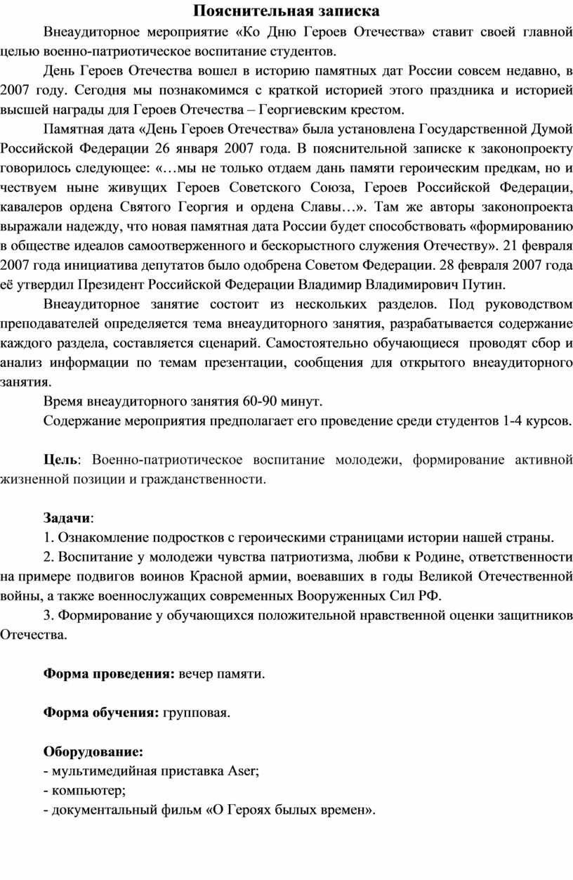Внеаудиторное мероприятие «Ко Дню Героев Отечества» ставит своей главной целью военно-патриотическое воспитание студентов.