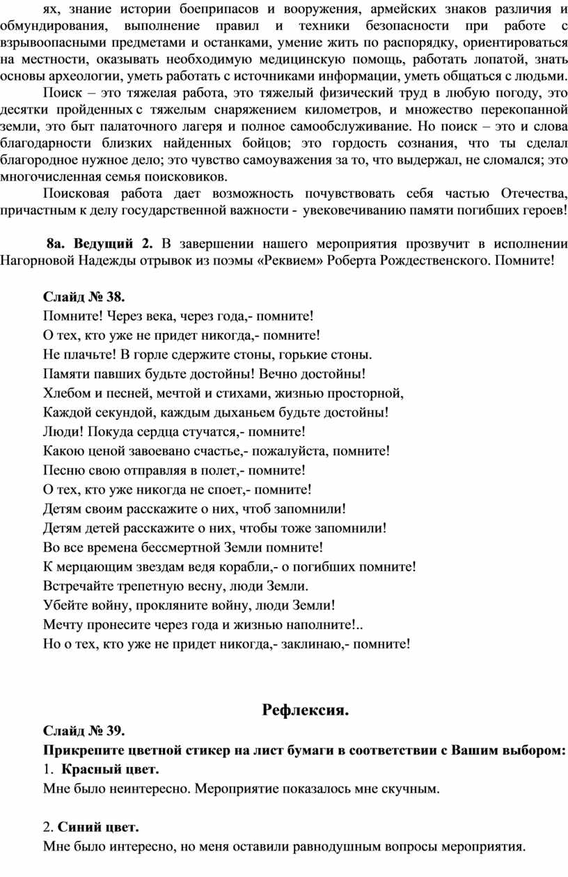 8а. Ведущий 2. В завершении нашего мероприятия прозвучит в исполнении Нагорновой Надежды отрывок из поэмы «Реквием» Роберта Рождественского. Помните!