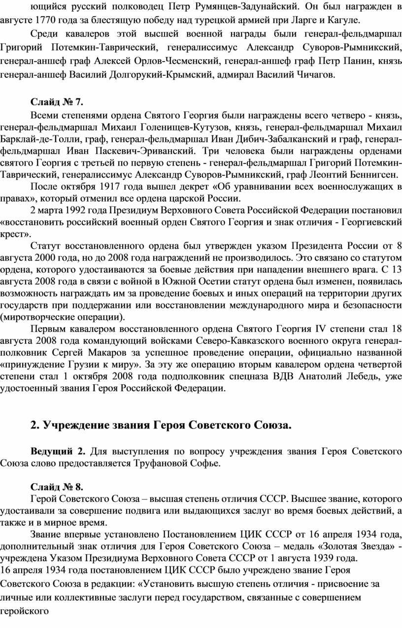 Ведущий 2. Для выступления по вопросу учреждения звания Героя Советского Союза слово предоставляется Труфановой Софье.