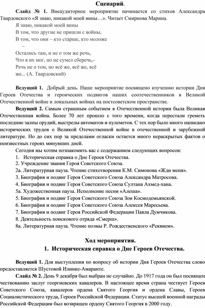 Ведущий 1. Добрый день. Наше мероприятие посвящено изучению истории Дня Героев Отечества и героических подвигов наших соотечественников в Великой Отечественной войне и локальных войнах на постсоветском пространстве.