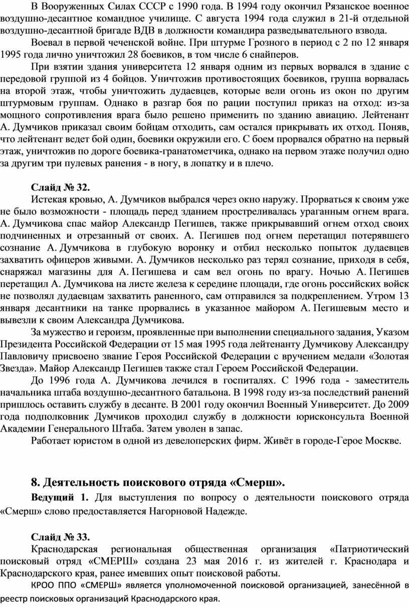 Ведущий 1. Для выступления по вопросу о биографии и подвиге Героя Российской Федерации Александра Павловича Думчикова слово предоставляется Харченко Виктории.