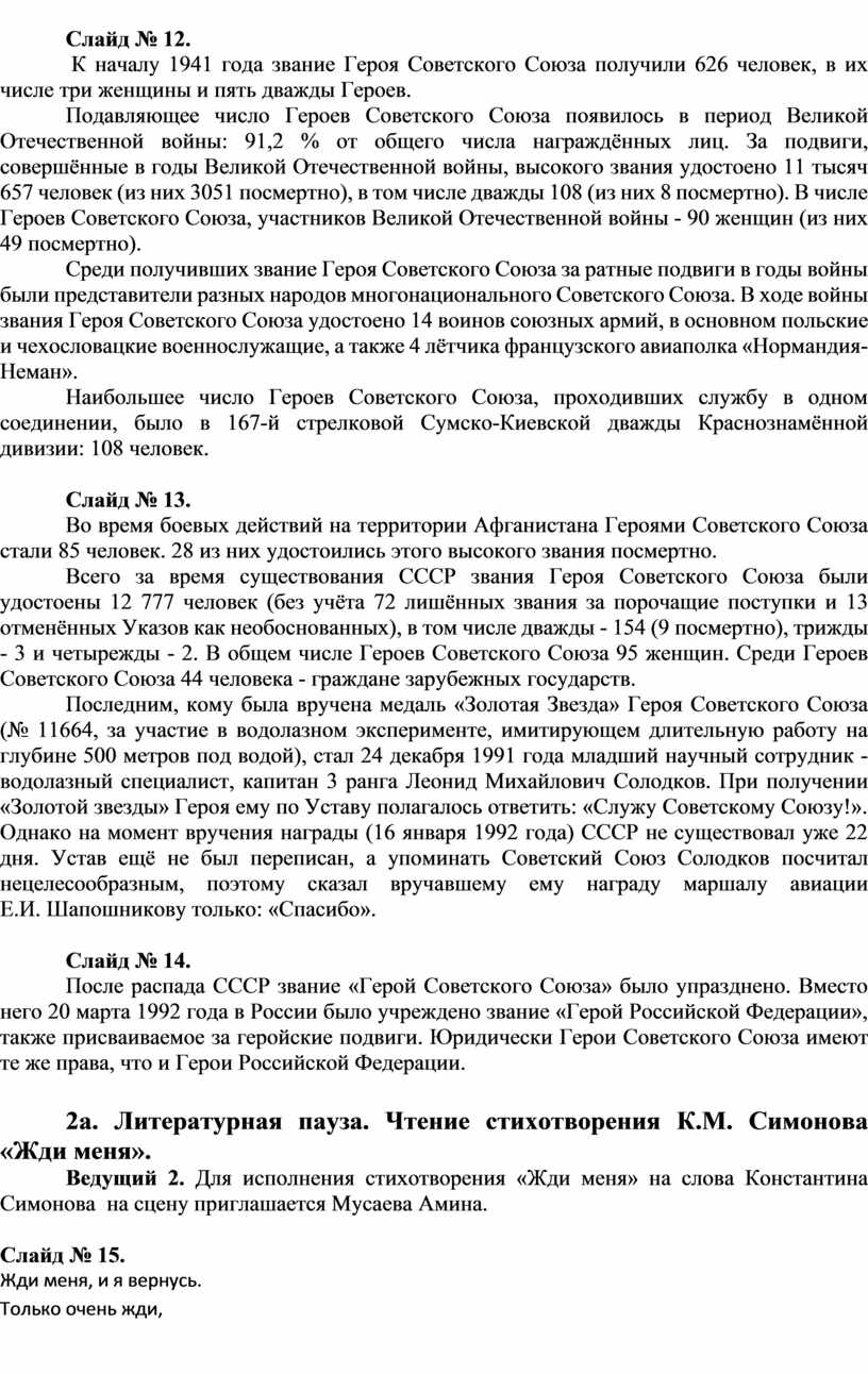 2а. Литературная пауза. Чтение стихотворения К.М. Симонова «Жди меня».