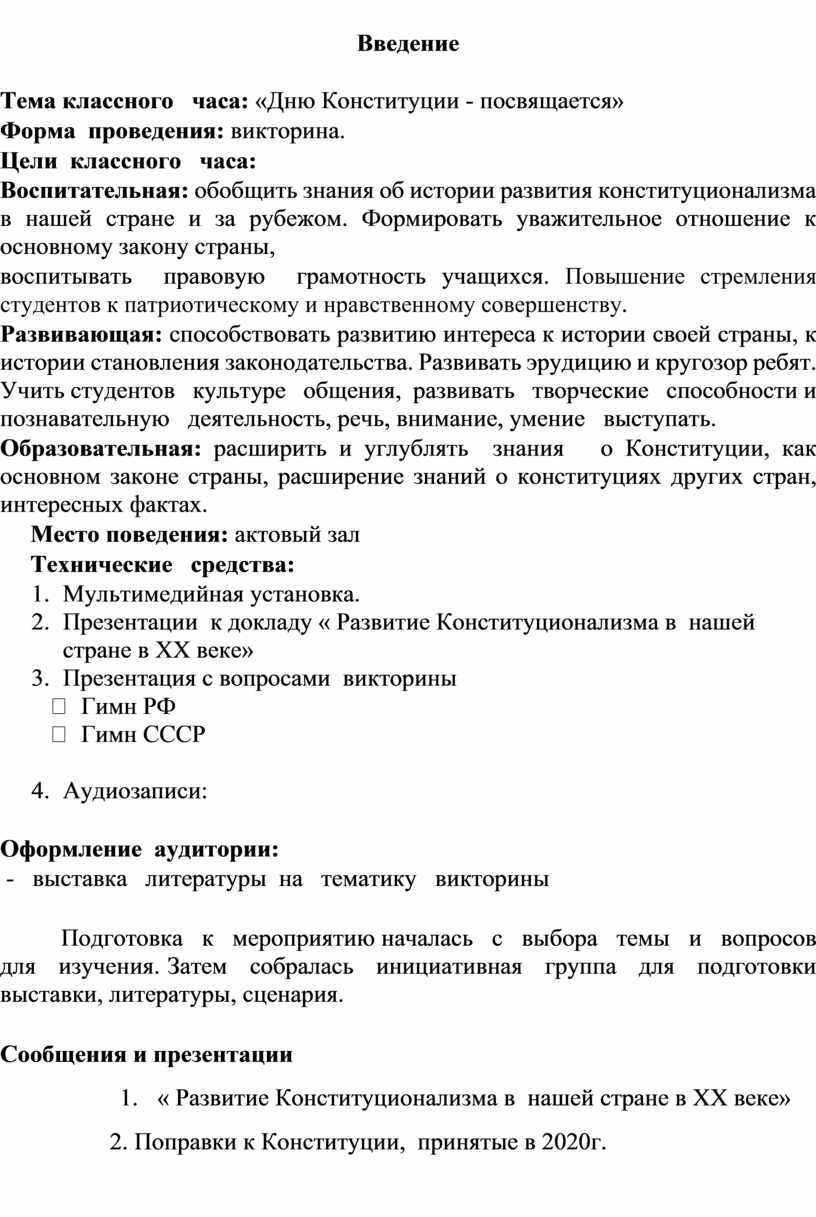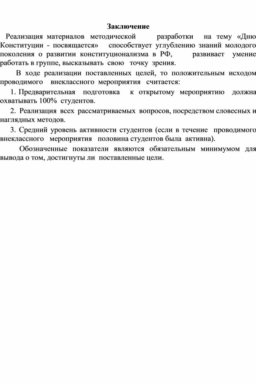 Реализация материалов методической разработки на тему «Дню Конституции - посвящается» способствует углублению знаний молодого поколения о развитии конституционализма в РФ, развивает умение работать в группе, высказывать свою точку зрения.