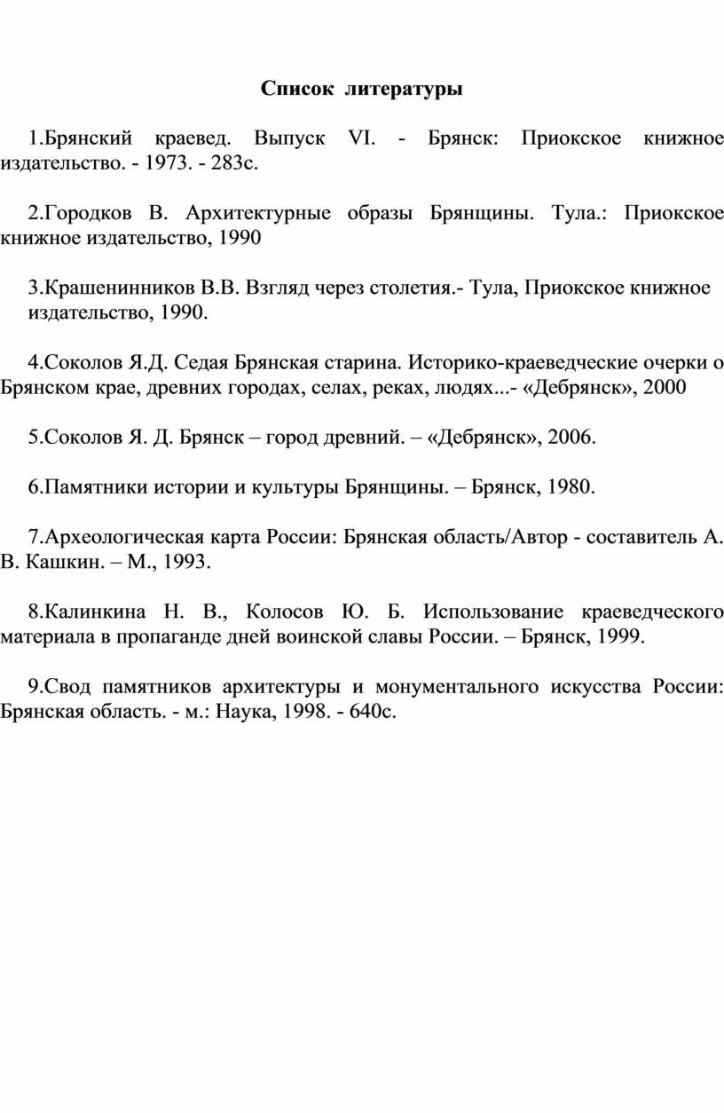 9.Свод памятников архитектуры и монументального искусства России: Брянская область. - м.: Наука, 1998. - 640с.