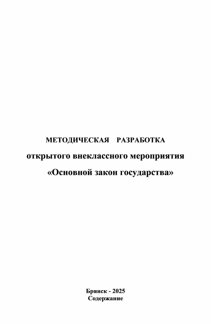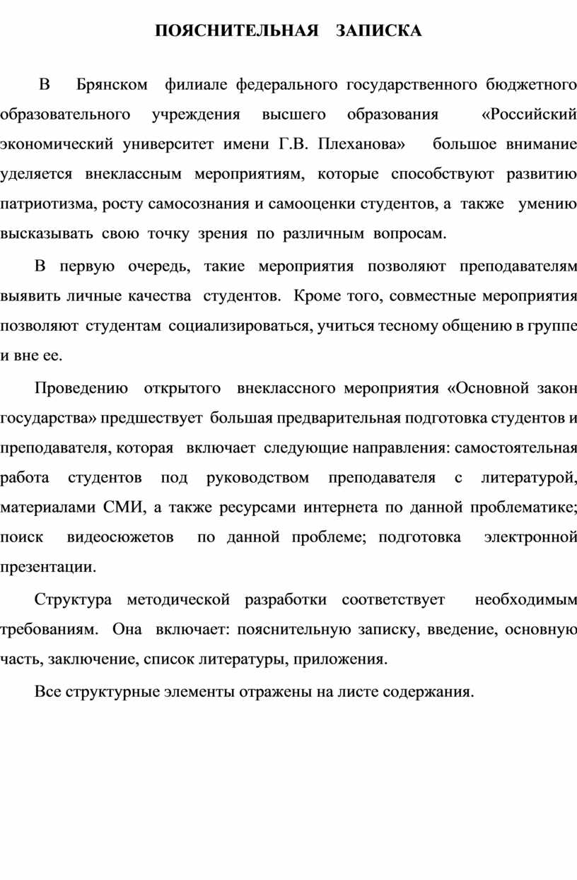 Проведению открытого внеклассного мероприятия «Основной закон государства» предшествует большая предварительная подготовка студентов и преподавателя, которая включает следующие направления: самостоятельная работа студентов под руководством преподавателя с литературой, материалами СМИ, а также ресурсами интернета по данной проблематике; поиск видеосюжетов по данной проблеме; подготовка электронной презентации.