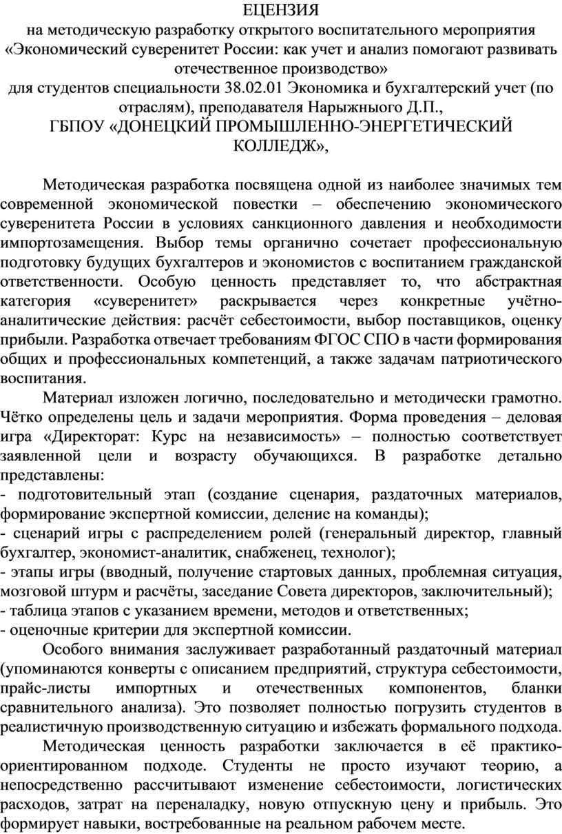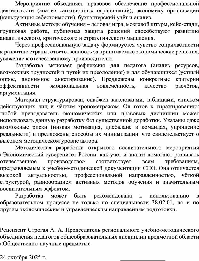 Методическая разработка открытого воспитательного мероприятия «Экономический суверенитет России: как учет и анализ помогают развивать отечественное производство» соответствует всем требованиям, предъявляемым к учебно-методической документации СПО. Она отличается высокой актуальностью, профессиональной направленностью, чёткой структурой, разнообразием активных методов обучения и значительным воспитательным эффектом.