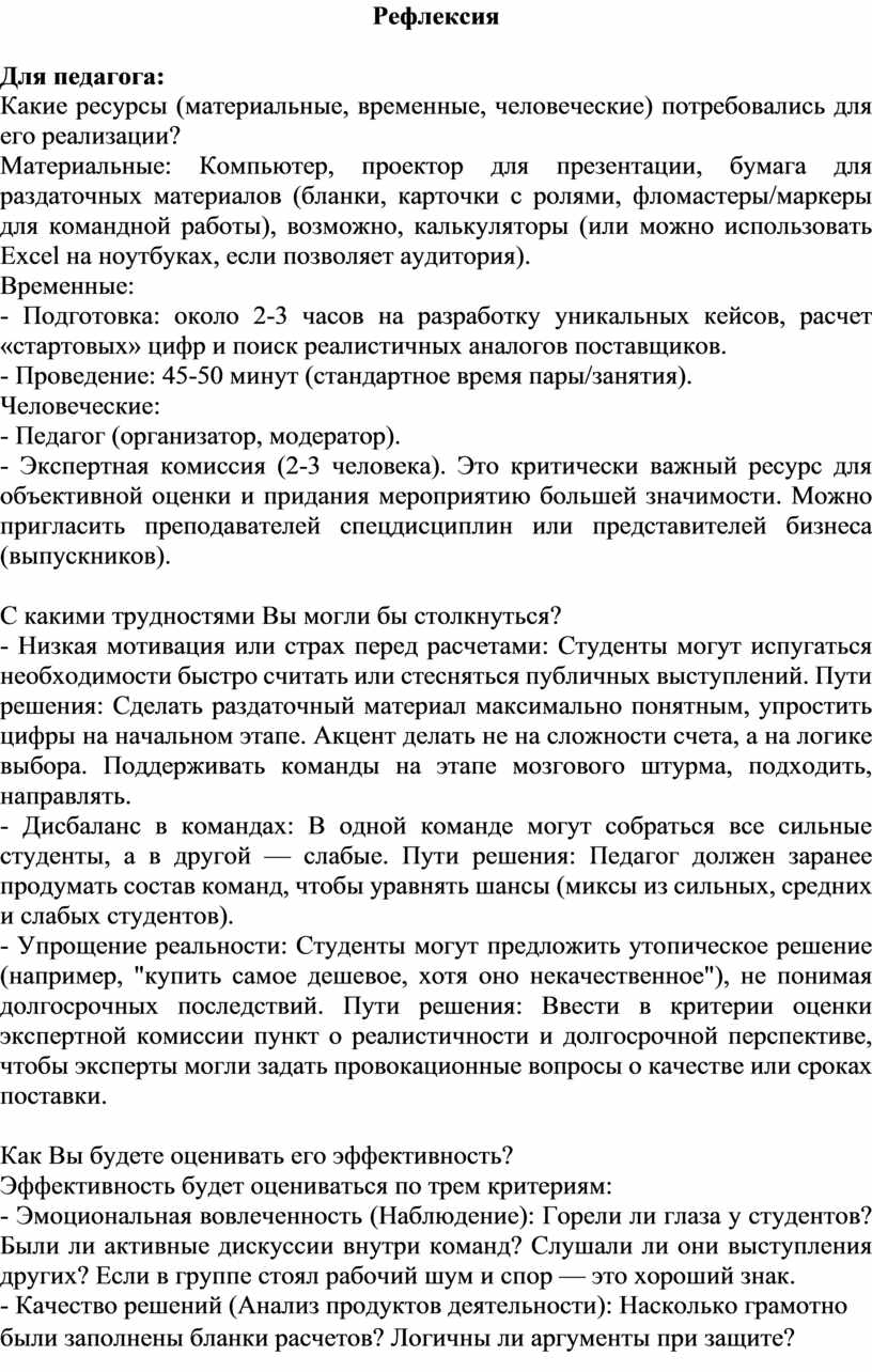 - Упрощение реальности: Студенты могут предложить утопическое решение (например, "купить самое дешевое, хотя оно некачественное"), не понимая долгосрочных последствий. Пути решения: Ввести в критерии оценки экспертной комиссии пункт о реалистичности и долгосрочной перспективе, чтобы эксперты могли задать провокационные вопросы о качестве или сроках поставки.