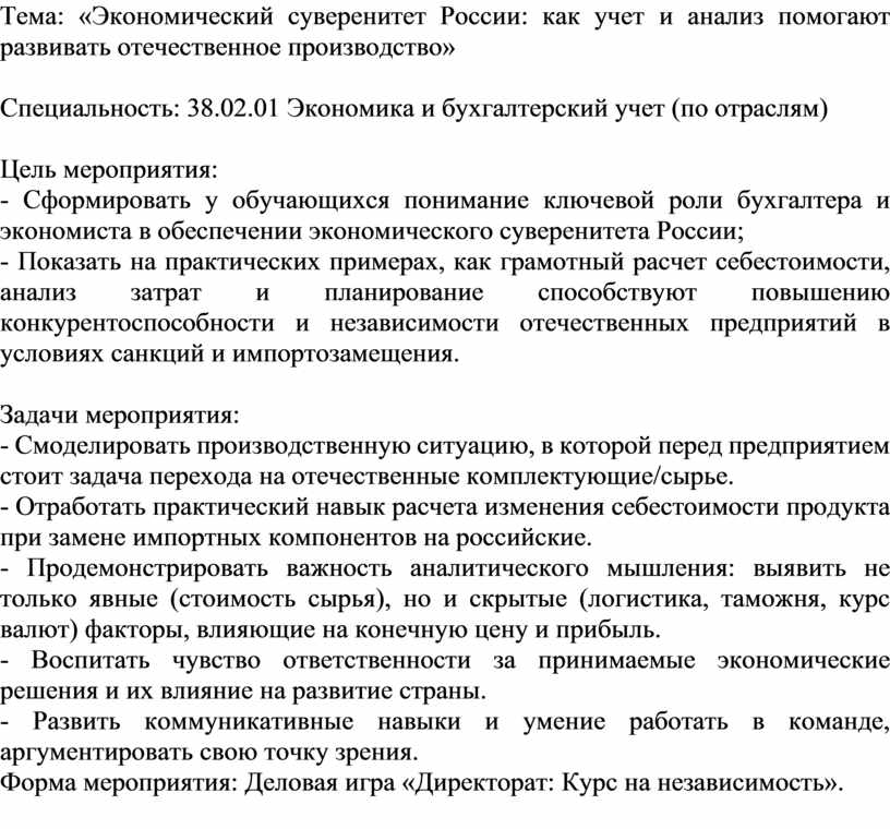 Методическая разработка посвящена одной из наиболее значимых тем современной экономической повестки – обеспечению экономического суверенитета России в условиях санкционного давления и необходимости импортозамещения. Выбор темы органично сочетает профессиональную подготовку будущих бухгалтеров и экономистов с воспитанием гражданской ответственности. Особую ценность представляет то, что абстрактная категория «суверенитет» раскрывается через конкретные учётно-аналитические действия: расчёт себестоимости, выбор поставщиков, оценку прибыли. Разработка отвечает требованиям ФГОС СПО в части формирования общих и профессиональных компетенций, а также задачам патриотического воспитания.