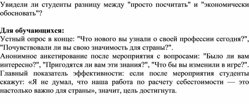 - Качество решений (Анализ продуктов деятельности): Насколько грамотно были заполнены бланки расчетов? Логичны ли аргументы при защите? Увидели ли студенты разницу между "просто посчитать" и "экономически обосновать"?