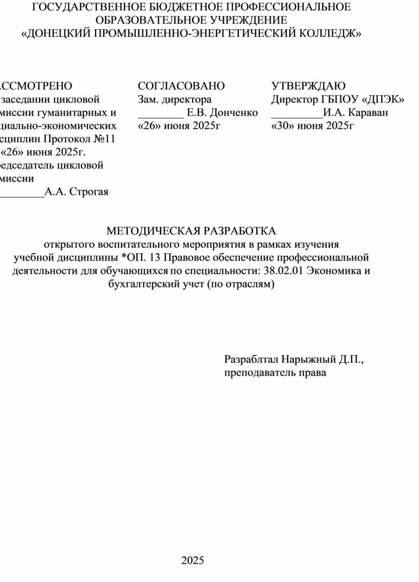 УТВЕРЖДАЮ Директор ГБПОУ «ДПЭК» _________И.А. Караван «30» июня 2025г