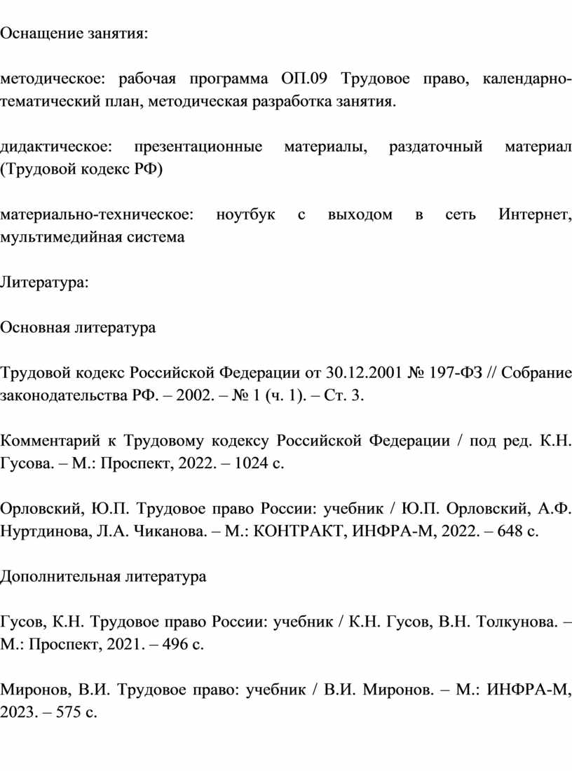 Гусов, К.Н. Трудовое право России: учебник / К.Н. Гусов, В.Н. Толкунова. – М.: Проспект, 2021. – 496 с.