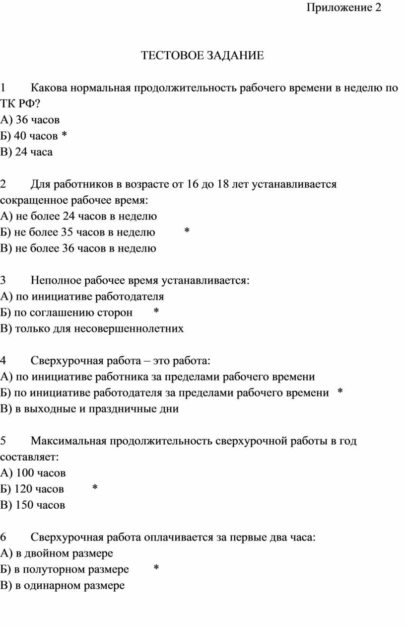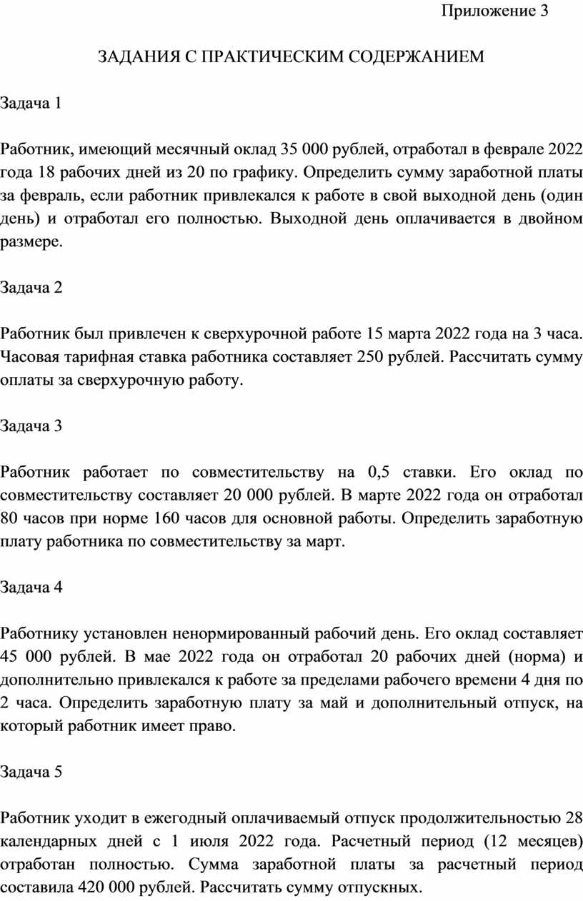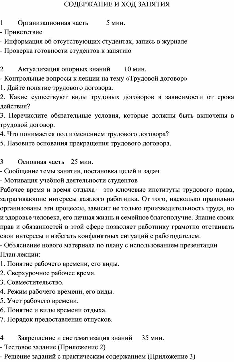 Высокое качество дидактического материала. Приложение 1 (лекция) изложено доступным языком, содержит ссылки на статьи Трудового кодекса РФ, четкие определения, классификации видов рабочего времени и времени отдыха. Вопросы для самоконтроля помогают студентам систематизировать знания. Тестовое задание (Приложение 2) включает 30 вопросов разного уровня сложности с выделенными правильными ответами и шкалой перевода в оценку, что позволяет объективно измерить результаты обучения. Практические задачи (Приложение 3) составлены с учетом реальных жизненных ситуаций (расчет зарплаты при сверхурочной работе, работе в выходной день, отпускных, компенсации при увольнении), что формирует у студентов навыки применения правовых норм.