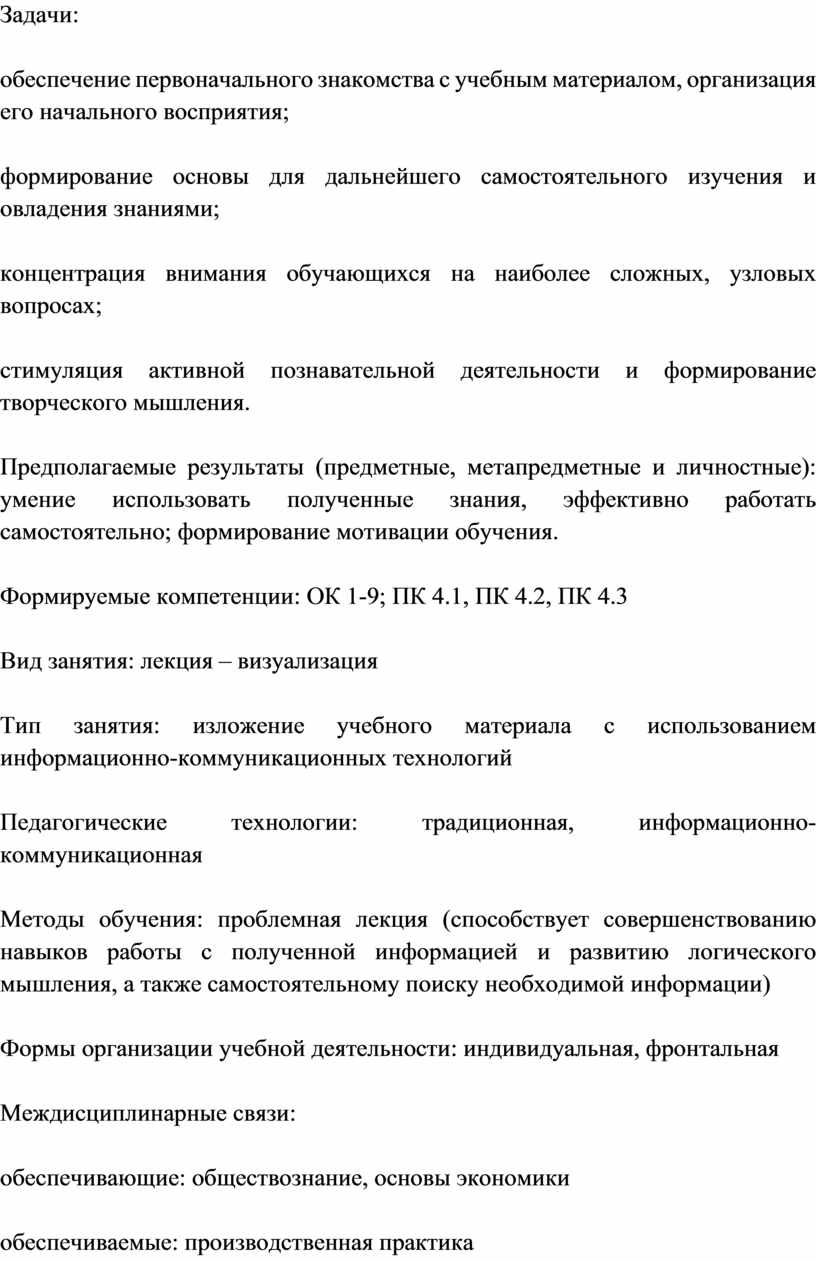 Методы обучения: проблемная лекция (способствует совершенствованию навыков работы с полученной информацией и развитию логического мышления, а также самостоятельному поиску необходимой информации)