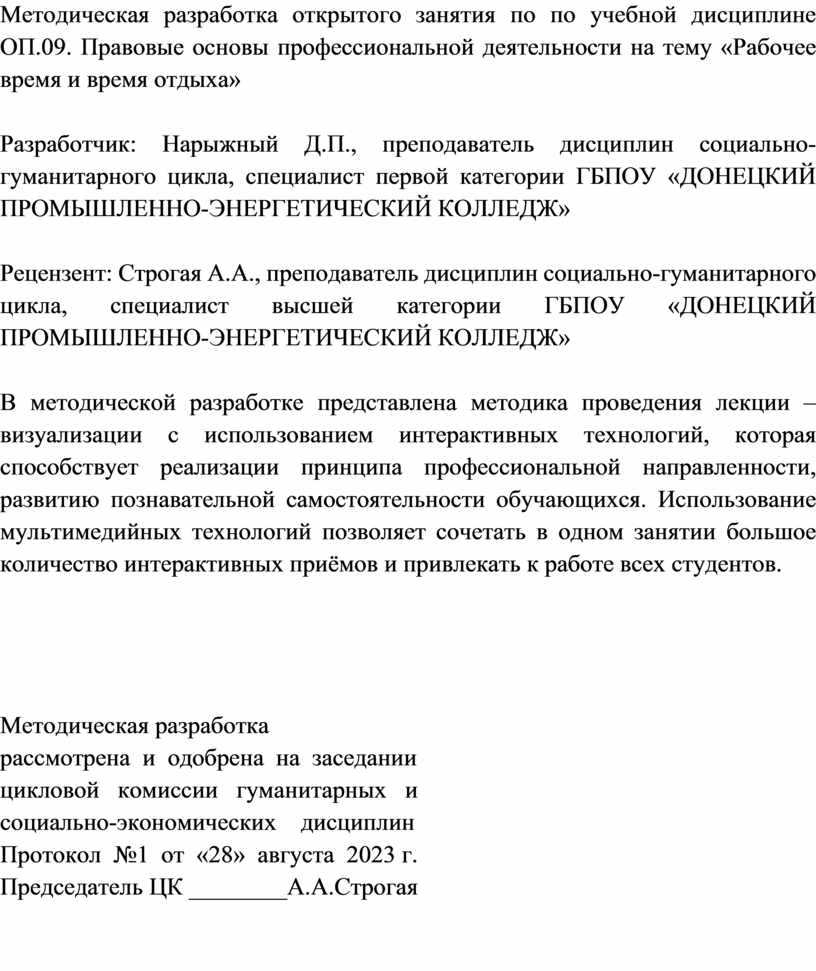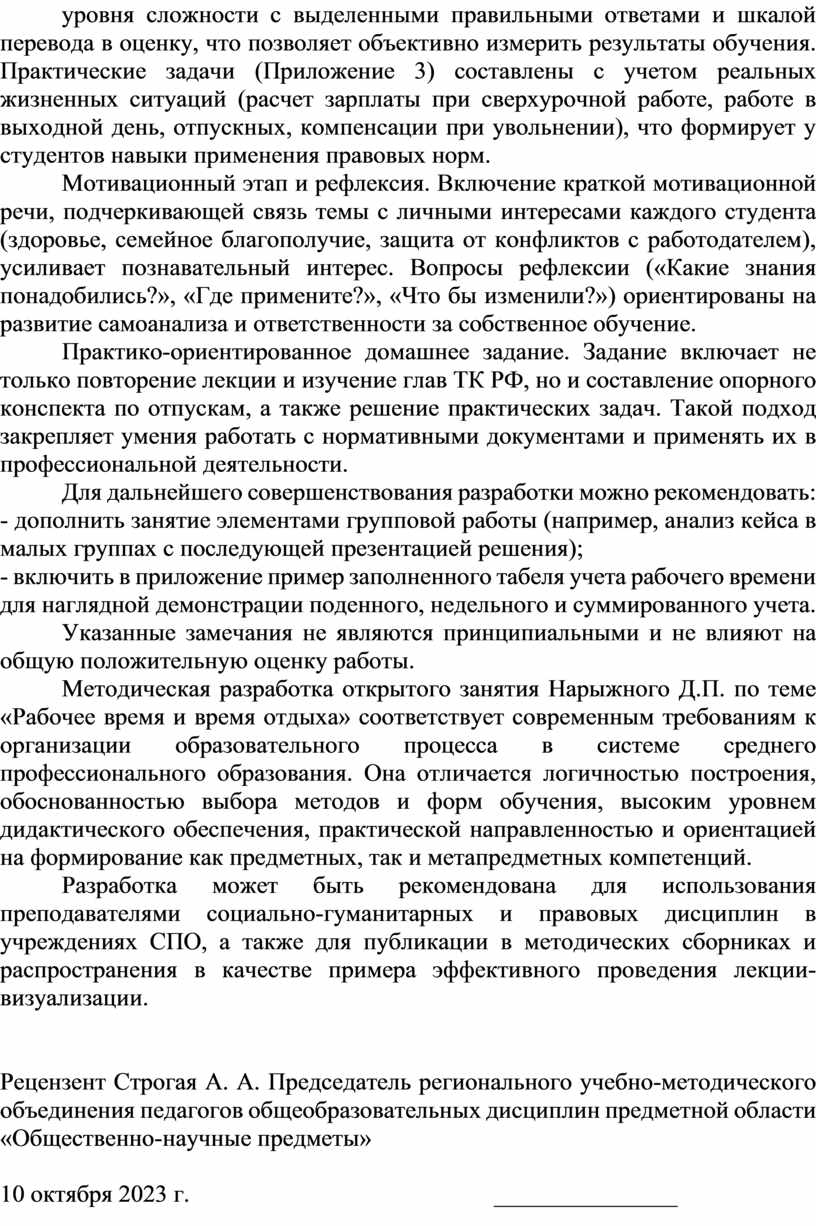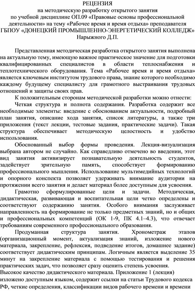Методическая разработка открытого занятия Нарыжного Д.П. по теме «Рабочее время и время отдыха» соответствует современным требованиям к организации образовательного процесса в системе среднего профессионального образования. Она отличается логичностью построения, обоснованностью выбора методов и форм обучения, высоким уровнем дидактического обеспечения, практической направленностью и ориентацией на формирование как предметных, так и метапредметных компетенций.