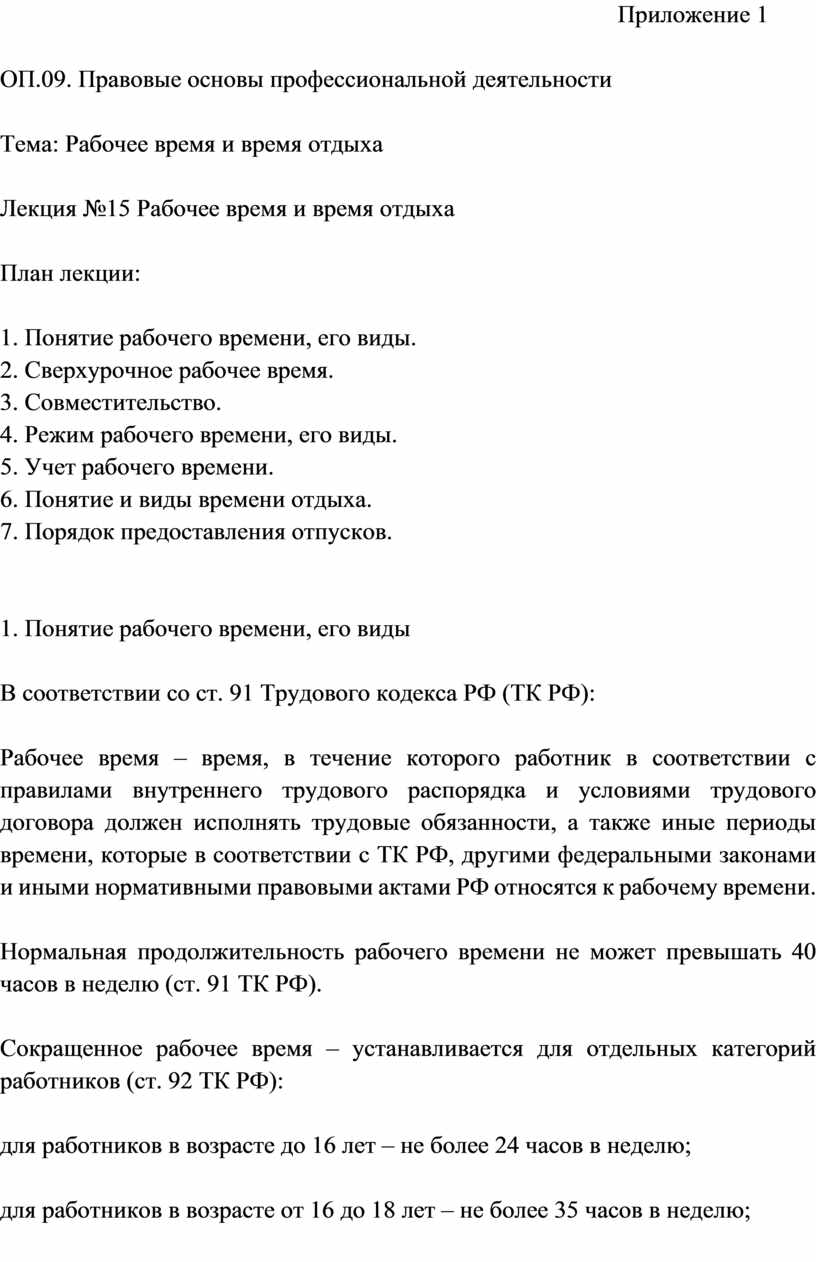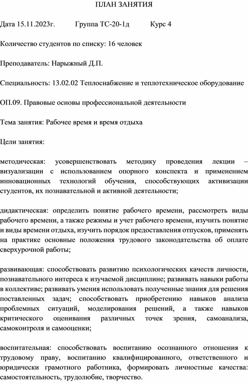 Методическая разработка открытого занятия по по учебной дисциплине ОП.09. Правовые основы профессиональной деятельности на тему «Рабочее время и время отдыха»