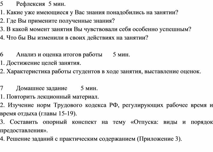 Мотивационный этап и рефлексия. Включение краткой мотивационной речи, подчеркивающей связь темы с личными интересами каждого студента (здоровье, семейное благополучие, защита от конфликтов с работодателем), усиливает познавательный интерес. Вопросы рефлексии («Какие знания понадобились?», «Где примените?», «Что бы изменили?») ориентированы на развитие самоанализа и ответственности за собственное обучение.