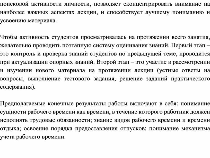 Предполагаемые конечные результаты работы включают в себя: понимание сущности рабочего времени как времени, в течение которого работник должен исполнять трудовые обязанности; знание видов рабочего времени и времени отдыха; освоение порядка предоставления отпусков; понимание механизма учета рабочего времени.
