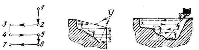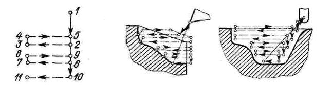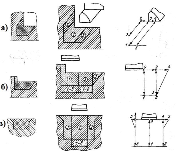 По схеме а следует обрабатывать наружные угловые канавки для выхода шлифовального круга. Число проходов зависит от соотношения размеров резца и канавки. Рекомендуется подбирать инструмент таким образом, чтобы обработку завершить за один или за три хода.