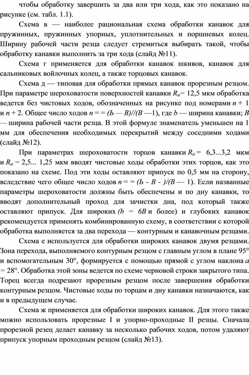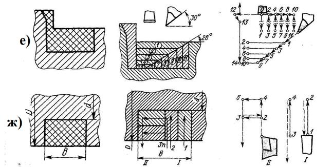 Схема д — типовая для обработки прямых канавок прорезным резцом. При параметре шероховатости поверхностей канавки Ra= 12,5 мкм обработка ведется без чистовых ходов, обозначенных на рисунке под номерами п + 1 и п + 2. Общее число ходов п = = (Ь — В)//(В —1), где b — ширина канавки; В — ширина рабочей части резца. В этой формуле знаменатель уменьшен на 1 мм для обеспечения необходимых перекрытий между соседними ходами (слайд №12).