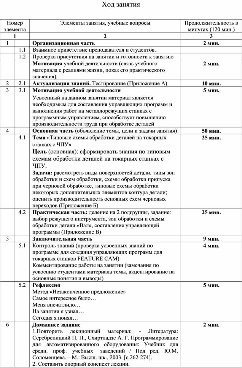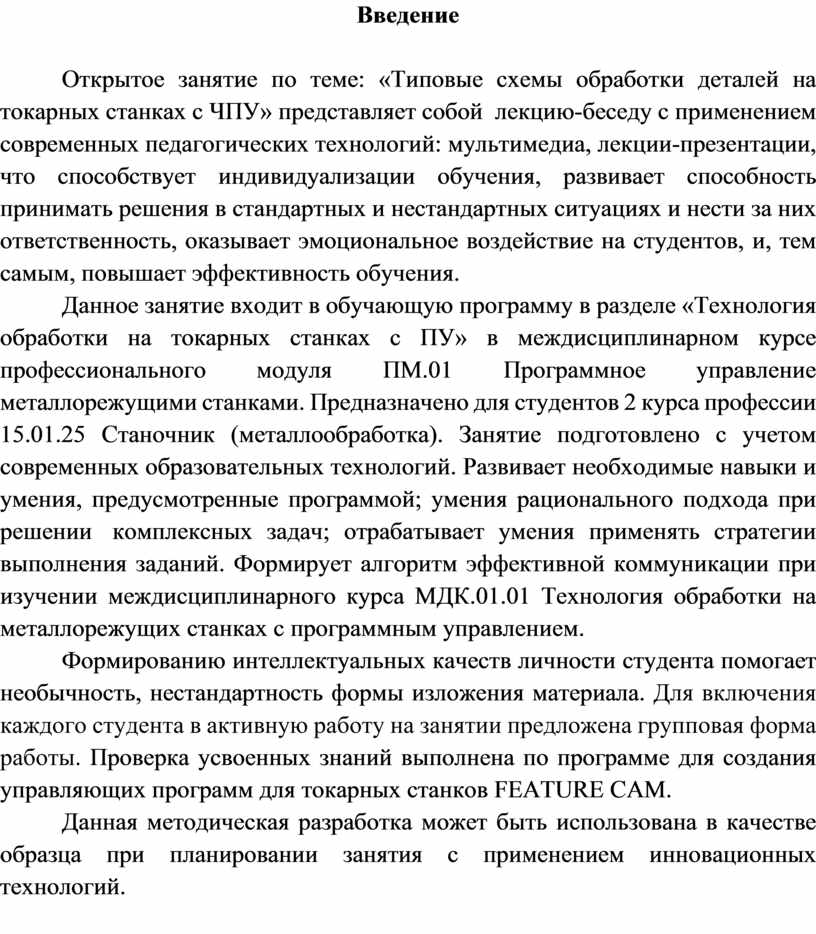Открытое занятие по теме: «Типовые схемы обработки деталей на токарных станках с ЧПУ» представляет собой лекцию-беседу с применением современных педагогических технологий: мультимедиа, лекции-презентации, что способствует индивидуализации обучения, развивает способность принимать решения в стандартных и нестандартных ситуациях и нести за них ответственность, оказывает эмоциональное воздействие на студентов, и, тем самым, повышает эффективность обучения.