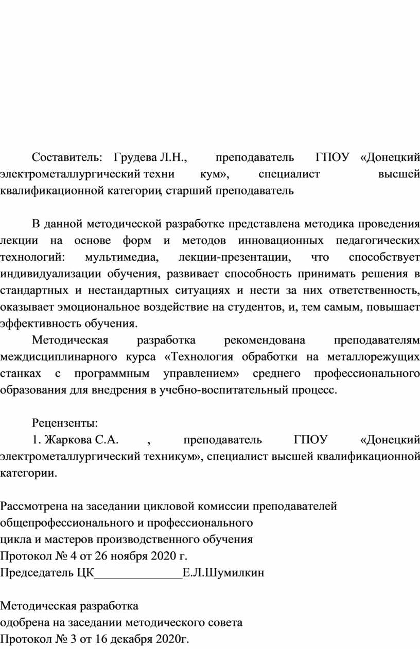 Методическая разработка рекомендована преподавателям междисциплинарного курса «Технология обработки на металлорежущих станках с программным управлением» среднего профессионального образования для внедрения в учебно-воспитательный процесс.