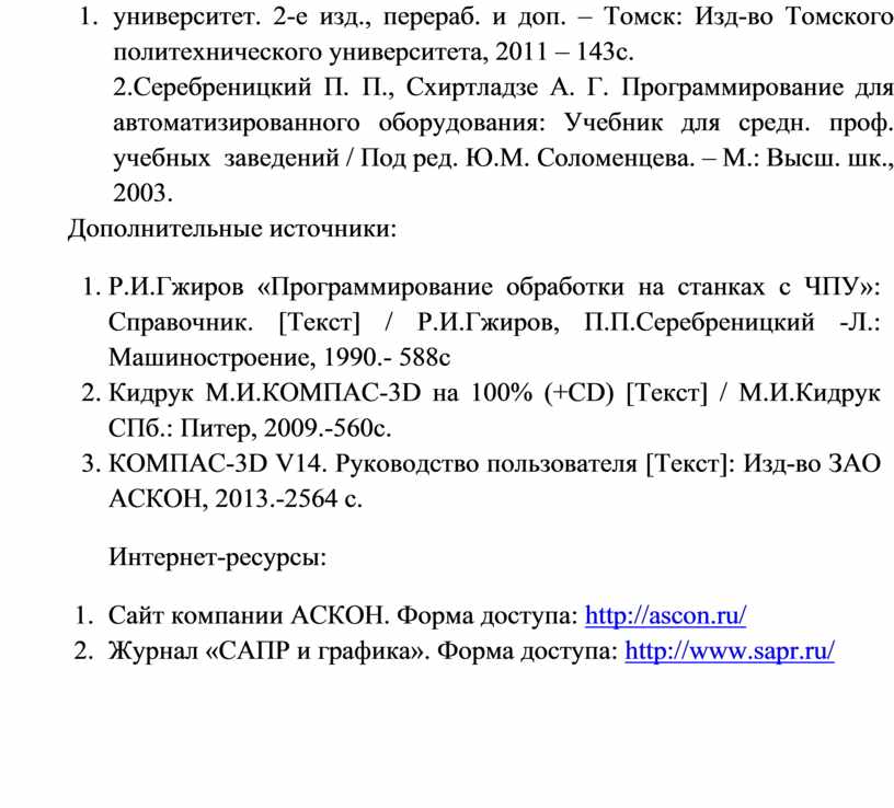 2.Серебреницкий П. П., Схиртладзе А. Г. Программирование для автоматизированного оборудования: Учебник для средн. проф. учебных заведений / Под ред. Ю.М. Соломенцева. – М.: Высш. шк., 2003.