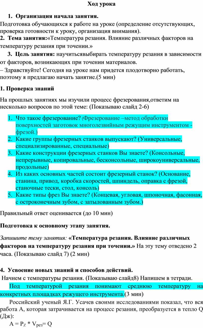 Запишите тему занятия: «Температура резания. Влияние различных факторов на температуру резания при точении.» На эту тему отведено 2 часа. (Показываю слайд 7) (2 мин)