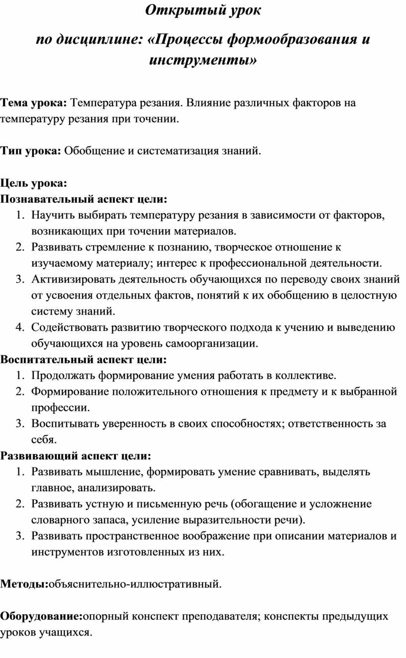 Методическая разработкаоткрытого занятия по дисциплине:«Процессы формообразования и инструменты» на тему: «Температура резания. Влияние различных факторов на температуру резания при точении.»предназначена для организации аудиторной работы обучающихся. Содержит как теоретические сведения, так и практический материал для изучения и закрепления полученных знаний, умений, навыков.