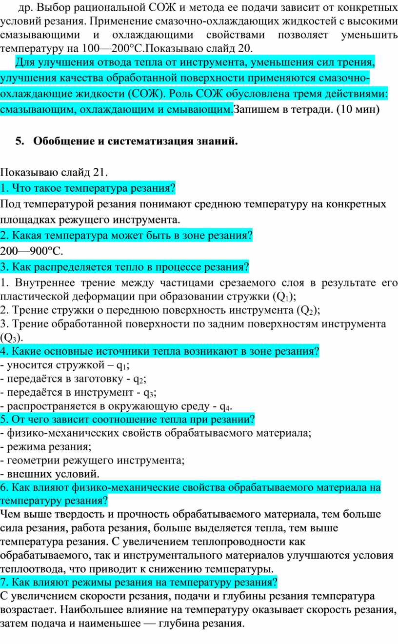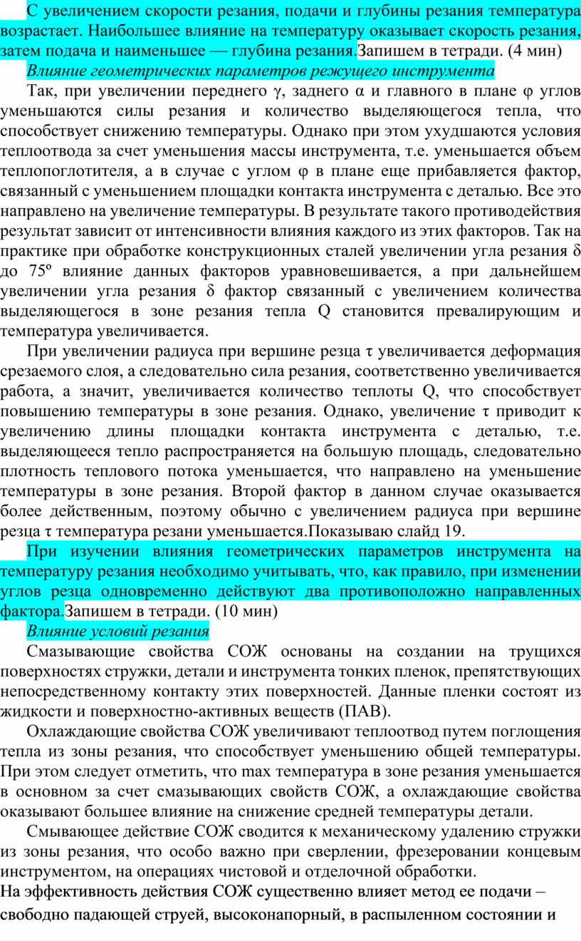 Применение смазочно-охлаждающих жидкостей с высокими смазывающими и охлаждающими свойствами позволяет уменьшить температуру на 100—200°С.(10 мин)