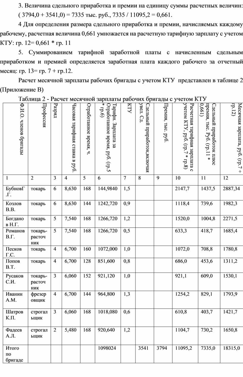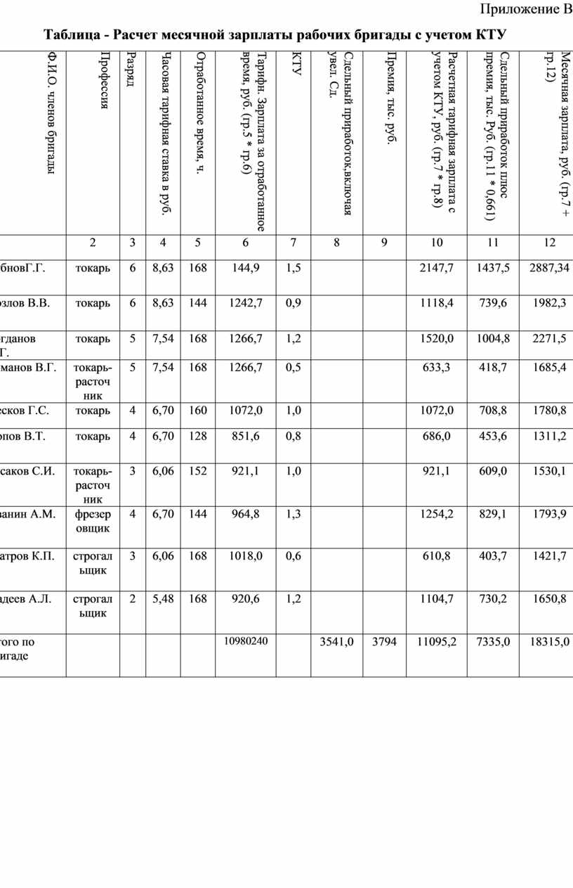 Таблица - Расчет месячной зарплаты рабочих бригады с учетом КТУ