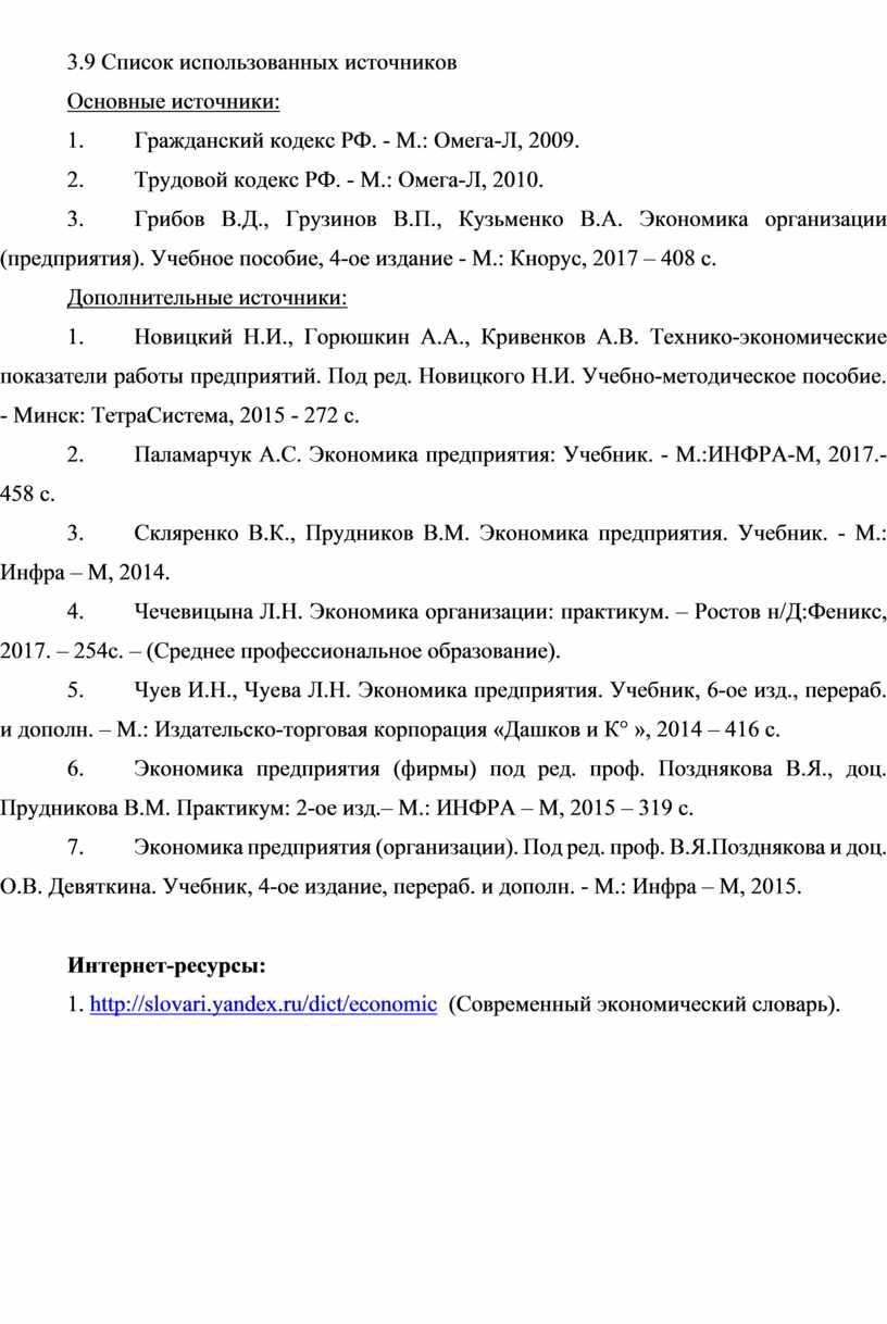 3. Список использованных источников: Грибов В.Д., Грузинов В.П., Кузьменко В.А. Экономика организации (предприятия); Чечевицына Л.Н. Экономика организации: практикум.